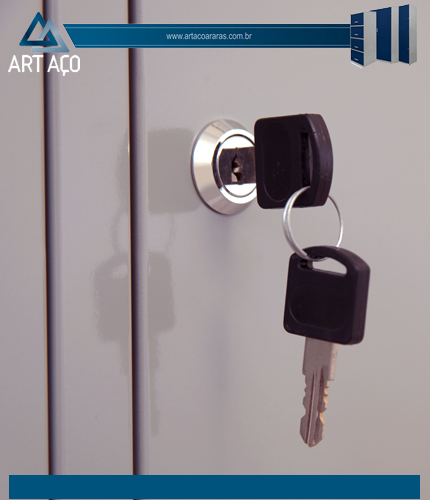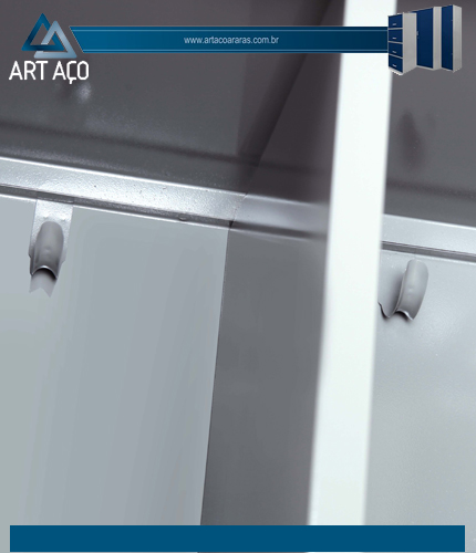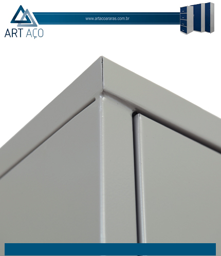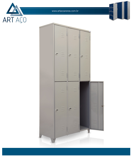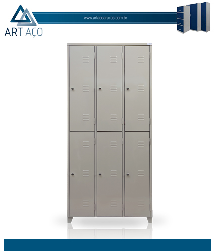 Armário roupeiro para vestiário, 6 vãos sobrepostos, 6 portas com reforço vertical interno, travamento por dispositivo tipo fechadura, 9 aberturas tipo veneziana para circulação de ar, 1 gancho como cabide por vão e 4 pés em chapa # 18 dobrada, destacando o conjunto do piso. Atende plenamente a NR 24.